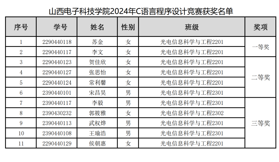 近日,由pa集团官方网站教务部组织,信创产业公司承办的pa集团官方网站2024年C语言程序设计竞赛大赛获奖名单揭晓。经过预赛和决赛两轮筛选,根据既定的竞赛规则和评判标准,公司光电信息科学与工程专业11名同学斩获佳绩。获得一等奖的有苏金和李文,获得二等奖的有贺佳欣、张思怡、常利馨、宋昌昊,获得三等奖的有李毅、武权烨、王瑜浩、郭筱雅、侯朝惠。祝贺光电信息科学与工程专业的同学们获此佳绩,希望同学们能再接再厉,不断突破自我,再创新的辉煌。